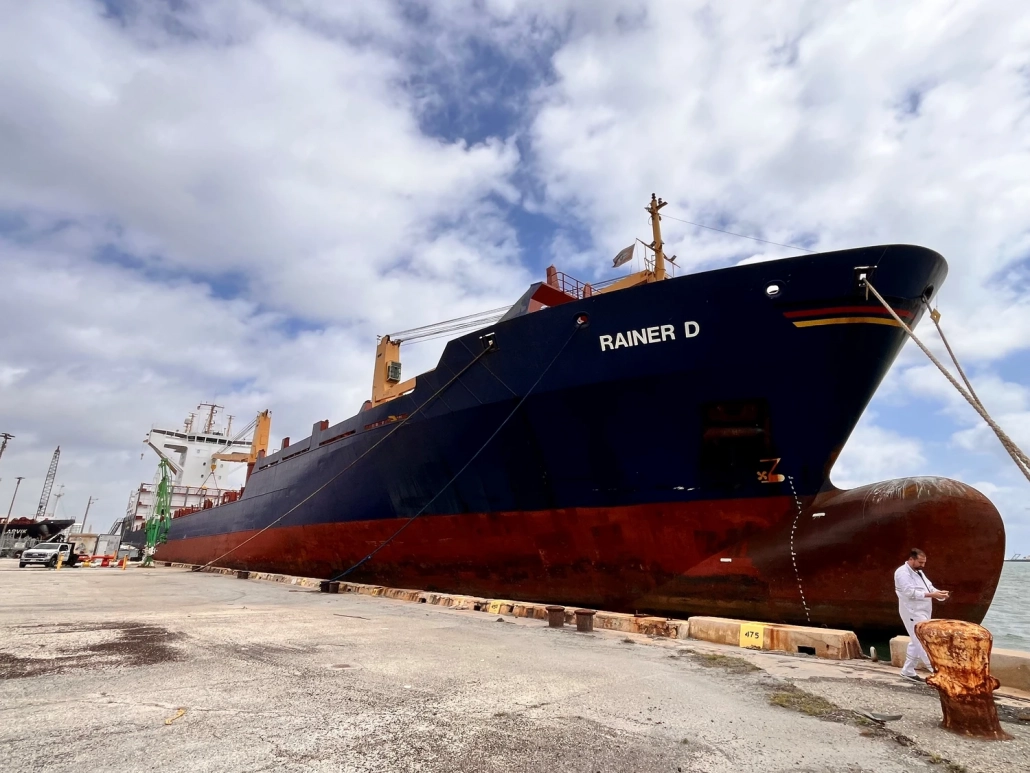 Handover of the cargo vessel “Rainer D” in the port of Miami (USA) to new owners – vessel alongside the quay with port cranes.
